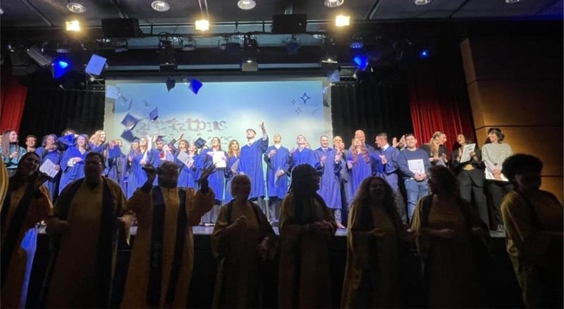 Image : Les diplômés 2025 de l’ESM réunis sur scène pour le traditionnel lancer de chapeaux, lors de la soirée des promotions, le 26.11.2025.
